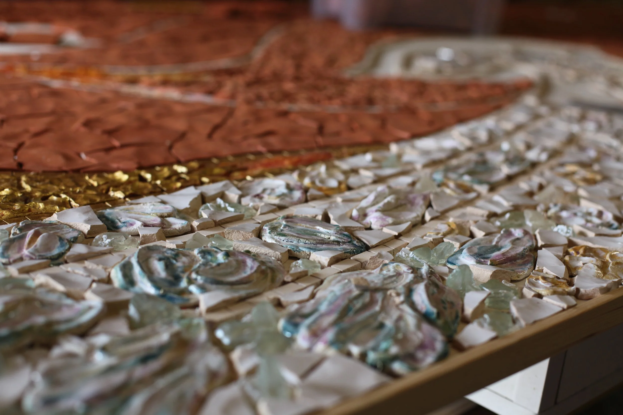 Pormenor de um painel de mosaico em curso no Atelier Paulo Nogueira
